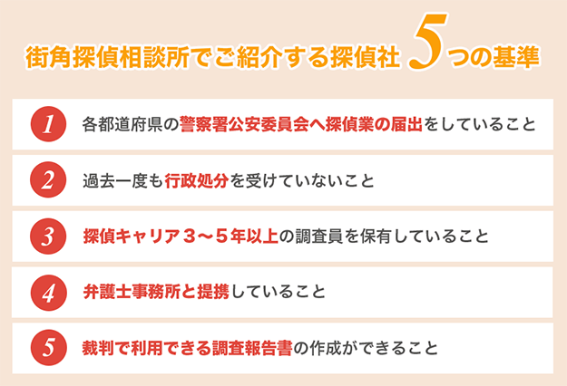 街角探偵相談所は、独自の審査基準を満たした信頼性の高い探偵事務所とだけ提携し、利用者に複数の探偵事務所を無料で紹介しています。(その際、あなたの個人情報が探偵事務所に漏れることはありません)